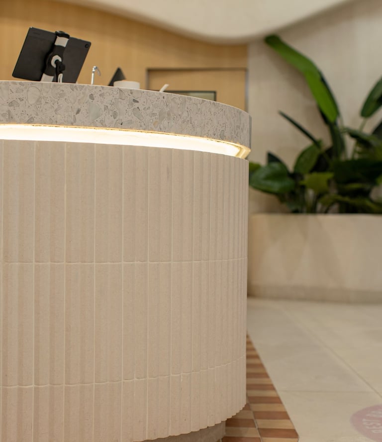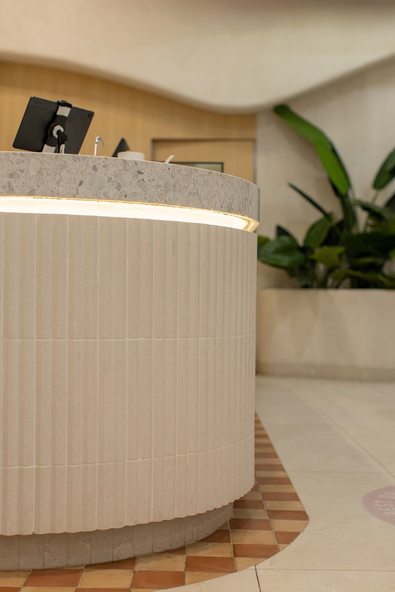 Creamos una atmósfera orgánica, con formas suaves y texturas naturales que respetan el contexto visual del local anfitrión. La barra curva, recubierta con terrazo artesanal y una base acanalada en microcemento tierra, se vuelve el corazón del espacio —elegante pero cercana. La iluminación perimetral refuerza su protagonismo sin estridencia.
