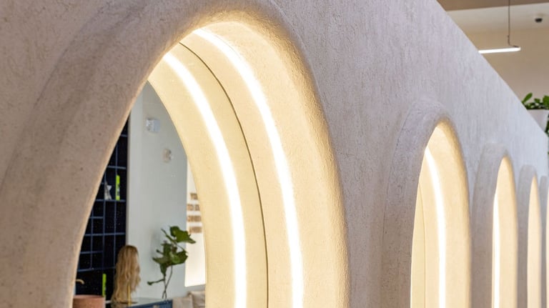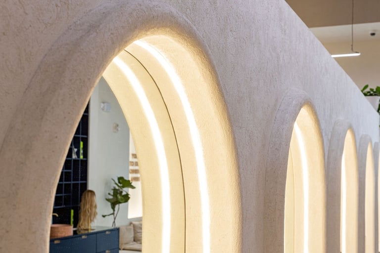 La arquitectura del proyecto gira en torno a formas suaves y envolventes. Nichos redondeados, mobiliario escultórico y estaciones de trabajo con siluetas curvas crean una atmósfera cálida y orgánica, alejándose de los tradicionales salones rígidos y lineales.